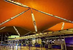 The stilt elevated undulating roof structure of the KLIA is supposed to imitate the traditional Malay-styled raised village houses. In Putrajaya, the Prime Minister's office is lined with wood panels to achieve the design goal. The underside of the KLIA's domed roof structure is similarly "clad in narrow strips of wood" which the architect suggests, "alludes to vernacular Malaysian timber structures, reinterpreting traditional building methods and strengthening the sense of local identity".