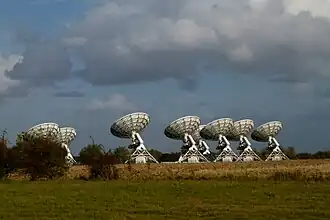 The 8 antennas of the Arcminute Microkelvin Imager Large Array viewed from Barton Road in 2012