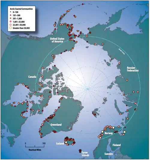 Though Arctic policy priorities differ, every Arctic nation is concerned about sovereignty/defense, resource development, shipping routes, and environmental protection.[26] Much work remains on regulatory agreements regarding shipping, tourism, and resource development in Arctic waters.[27] Arctic shipping is subject to some regulatory control through the International Code for Ships Operating in Polar Waters, adopted by the International Maritime Organization on 1 January 2017 and applies to all ships in Arctic waters over 500 tonnes.[28][29]
