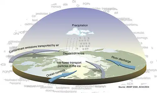The Arctic is comparatively clean, although there are certain ecologically difficult localized pollution problems that present a serious threat to people's health living around these pollution sources. Due to the prevailing worldwide sea and air currents, the Arctic area is the fallout region for long-range transport pollutants, and in some places, the concentrations exceed the levels of densely populated urban areas. An example of this is the phenomenon of Arctic haze, which is commonly blamed on long-range pollutants. Another example is with the bioaccumulation of PCBs (polychlorinated biphenyls) in Arctic wildlife and people.