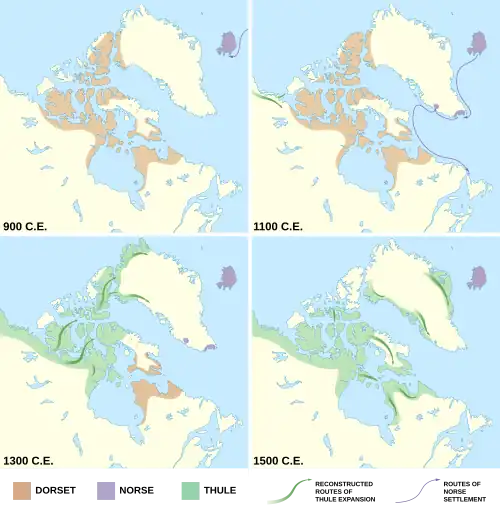 The Dorset / Thule culture transition dates around the ninth–10th centuries CE. Scientists theorize that there may have been cross-contact between the two cultures with the sharing of technology, such as fashioning harpoon heads, or the Thule may have found Dorset remnants and adapted their ways with the predecessor culture.[22] The evidence suggested that Inuit descend from the Birnirk of Siberia, through the Thule culture expanded into northern Canada and Greenland, where they genetically and culturally completely replaced the Indigenous Dorset people sometime after 1300 CE.[23] The question of why the Dorset disappeared so completely has led some to suggest that Thule invaders wiped out the Dorset people in "an example of prehistoric genocide."[24]