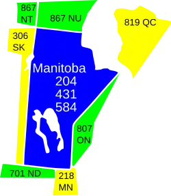 Area codes 204, 431, and 584 are telephone area codes in the North American Numbering Plan (NANP) for the Canadian province of Manitoba. Area code 204 is one of the nine original North American area codes assigned to Canada in 1947. Area codes 431 and 584 were assigned to the same numbering plan area (NPA) in 2012 and 2022, respectively, forming an overlay complex.