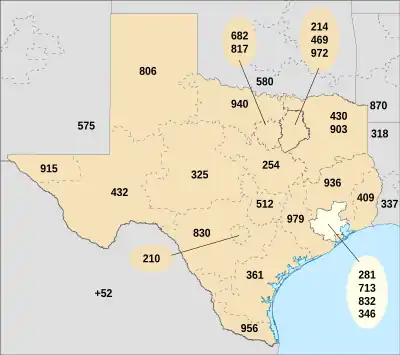 Texas area codes: 210/726, 214/469/972/945, 254, 325, 361, 409, 432, 512/737, 713/281/832/346, 806, 817/682, 830, 903/430, 915, 936, 940, 956, 979