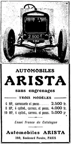 The Arista was a French automobile manufactured by the Établissements Ruffier in Paris from 1912 to 1915. The marque took its name from its founder, one P. Arista-Ruffier. Eight models were introduced in the first year of production; these were a 720 cc single cylinder cycle car, fours of 1460 cc, 1726 cc, and 1847 cc which featured friction drive and were sold complete with bodywork and tires, and fours of 1460 cc, 1593 cc, 1847 cc, and 2001 cc with conventional gearboxes; these last were sold as untired chassis.