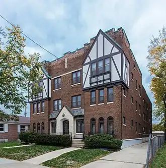 It is a three-story red brick block with then-fashionable Tudor Revival style that is about 109 feet (33 m) by 46 feet (14 m). Tudor Revival was used for numerous houses in Waukesha, but this is the only Tudor Revival-style apartment building.[3]