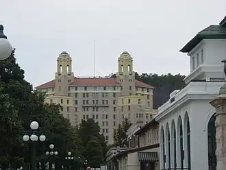 Those buildings were at the north end of Bathhouse Row, where the Arlington Park then was created. The third Arlington Hotel, designed by Mann and Stern in 1924, is the current hotel at the "Y" intersection at the corner of Central Avenue and Fountain Street. The building's huge size, Spanish-Colonial Revival style, and placement at the terminus of the town's most important vista made the building a key Hot Springs landmark. The original site became a park at the north end of Bathhouse Row.[5]