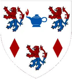 Escutcheon: Argent, in chief between two lions rampant per fess gules and azure an ancient lamp of the last enflamed gules, and in base a like lion between two lozenges also gules. |