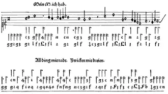 In most settings Schlick uses mixed notation: the upper part is notated mensurally, while the lower parts are given in tablature.[49] The practice was rarely used in Germany at the time, but it appears in many contemporary French and Italian sources, such as collections of frottolas by Franciscus Bossinensis (1509–1511) or Marchetto Cara (c. 1520), and Pierre Attaingnant's publications (late 1520s).[50] Another important deviation from the German norm is Schlick's tendency to put the cantus firmus in the highest part, the discantus, whereas the norm for German Lieder was cantus firmus in the tenor.