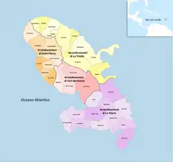 At the creation of the department of Martinique in 1947, its only arrondissement was Fort-de-France.[2] The arrondissement of La Trinité, containing 10 communes that were previously part of the arrondissement of Fort-de-France, was created in 1965.[3] The arrondissement of Le Marin, containing 12 communes that were previously part of the arrondissement of Fort-de-France, was created in 1974.[4] The arrondissement of Saint-Pierre, containing eight communes that were previously part of the arrondissement of Fort-de-France, was created in 1995.[5]