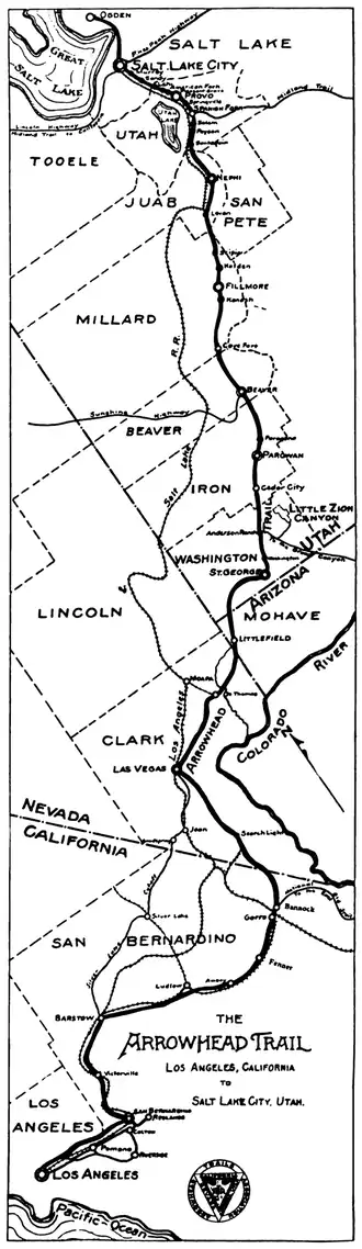 The Arrowhead Trail or Arrowhead Highway was the first all-weather road in the Western United States that connected Los Angeles, California with Salt Lake City, Utah by way of Las Vegas, Nevada. Built primarily during the auto trails period of the 1910s, prior to the establishment of the United States Numbered Highway System, the road was replaced in 1926 by U.S. Route 91 (US 91) and subsequently Interstate 15 (I-15).[4][5] Small portions of the route in California, Nevada, and Utah are sometimes still referred to by the name, or as Arrow Highway.