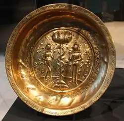 Middle and Late Minoan and Mycenaean vessels are many. First in size are some basins found at Tylissos in Crete, the largest measuring 1.40 metres in diameter. They are shallow hemispherical bowls with two or three loop-handles riveted on their edges, and are made in several sections. The largest is composed of seven hammered sheets, three at the lip, three in the body, and one at the base. This method of construction is usual in large complicated forms. The joints of necks and bodies of jugs and jars were often masked with a roll-moulding. Simpler and smaller forms were also cast. The finest specimens of such vases come from houses and tombs at Knossos. Their ornament is applied in separate bands, hammered or cast and chased, and soldered on the lip or shoulder of the vessel. A richly decorated form is a shallow bowl with wide ring-handle and flat lip, on both of which are foliate or floral patterns in relief.[1]