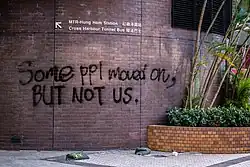 Graffiti is considered as uncivil disobedience, but a method of communication to express dismay which is restricted verbally under the Hong Kong National Security Law. Commentators consider graffiti walls as uncivil disobedience and questions whether such a method is justified in seeking the government's response to the Anti-Extradition Law Bill.[61] It is suggested that graffiti paintings are random and without specific form and structure, but would influence an individual into collective actions. Consistency in the graffiti's theme, style and textual expressions elevate the sense of solidarity,[62] and it emphasises the responsibility in engaging in resistance as a Hongkonger.[61] There is an underlying message in the graffiti which would link one's opinion to another person's similar opinion.[63] Graffitiing is a sign of delegitimising the government and the police force,[61] as they have lost their power to control and limit public spaces for giving opinions. It is also sign of 'act of resistance' because the painter aims to regain power which has been taken away by the government.[64] The goal of requesting for change is delivered through graffitis,[65] and is a way in seeking communications with the government and opposing parties.[66]