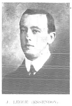 Playing at forward-pocket in Essendon's 1908 VFL Grand Final team,[6] Legge kicked the second of Essendon's three goals in its 3.8 (26) to 5.5 (35) loss to Carlton. His last game for Essendon was in the side that lost 8.11 (59) to 9.14 (68) to University on 22 May 1909.