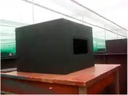 A mirror box is an artificial sky consisting of a luminous ceiling and mirrored walls, used to replicate uniform or overcast skies. In a mirror box, a consistent luminance distribution is created from reflections of the light from the mirrored walls and an appropriate estimation of CIE standard overcast sky is simulated.[4] The light source is the white diffusing material illuminated by several lamps from behind to diffuse the light throughout the room with help of sensors.[5] The walls of the room are surrounded by plane mirrors organized vertically on all sides, which produces an image of the luminous ceiling by reflection and inter-reflection.[5]