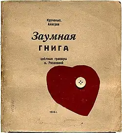 Key works such as Worldbackwards (1912), by Khlebnikov and Kruchenykh, Natalia Goncharova, Larionov Rogovin and Tatlin, Transrational Boog (1915) by Aliagrov and Kruchenykh & Olga Rozanova, and Universal War (1916) by Kruchenykh used hand-written text, integrated with expressive lithographs and collage elements, creating small editions with dramatic differences between individual copies. Other titles experimented with materials such as wallpaper, printing methods including carbon copying and hectographs, and binding methods including the random sequencing of pages, ensuring no two books would have the same contextual meaning.[13] Marinetti visited in 1914, proselytizing on behalf of Futurist principles of speed, danger, and cacophony.[14][15]