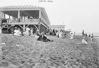 Uriah White, an Asbury Park pioneer, installed the first artesian well water system.[38] As many as 600,000 people a year vacationed in Asbury Park during the summer season in the early years, riding the New York and Long Branch Railroad from New York City and Philadelphia to enjoy the mile-and-a-quarter stretch of oceanfront Asbury Park.[38] By 1912, The New York Times estimated that the summer population could reach 200,000, some 20 times the city's year-round population.[39]