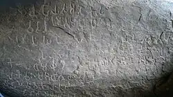 Ashoka the great expounded his policy of Dhamma through his edicts.[22] By engraving his views about Dhamma on these edicts, Ashoka tried to directly communicate with his subjects.[23] These inscriptions were written in different years of his life.[24] The inscriptions can be divided into two categories. A small group of inscriptions reveal that the king was a follower of Buddhism and were addresses to the Buddhist church—the Sangha. These inscriptions are declarations of Ashoka's relationship with the Buddhist order.[25] Inscriptions of the other category are known as the Major and Minor Rock Edicts, which were inscribed on rock surfaces. This larger group includes the Pillar Edicts inscribed on specially erected pillars.[26][27]