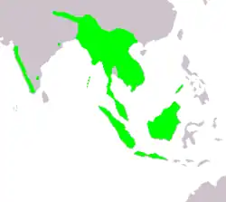 The Asian fairy bluebird is found in Sri Lanka and the western coast of India from Travancore up to the latitude of Shivamogga, Belgaum and Sawantwadi; Sikkim and the lower ranges of the Himalayas to Dibrugarh in Assam; the Khasi Hills; Cachar; Manipur; Bangladesh; Arrakan; Bago and Taninthayi Division in Burma; the Andaman and Nicobar Islands. In southeast Asia it occurs throughout most of Indochina (including Peninsular Malaysia), Sumatra, Borneo, Java and on smaller nearby islands. In the Indian part of its range this species is confined to the evergreen forests of the hills and plains, but elsewhere it is regular in various types of humid and deciduous forests from lowlands up to about 1,600 metres (5,200 ft). The species has been reported to be more frequent in mature rainforests and in rustic cardamom plantations under native shade trees than in coffee plantations.[2]