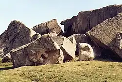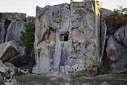 Yılantaş rock-cut tomb is located nearly 70 m (230 ft) west of Aslantaş tomb. It was larger and more magnificent than Aslantaş, but the rock, on which it was found, is broken apart probably by an earthquake or another natural disaster. The claws of two lions touching each other appear on one of the fragments of lion reliefs carved into the outer surface of the rock. The rock was called by the locals Yılantaş (literally: "Snakestone") because the eroded claw figures were wrongly believed to be snake heads. The rear and left side walls of the destroyed burial chamber are still visible on the bedrock. The right side wall with large lion reliefs on the outer surface and the north facing tomb entrance as well as the front face were demolished. There is only one burial chamber. On pitched roofs, rafters were also carved in relief. There are two klinai in front of the back wall, one on the right side wall. There is also a small third on the right wall near the entrance. However, the two klinai are more likely to be a seat due to the size and leg ornamentation that differs from the other ones. The triangular form of the inclined roof can be seen on the back wall of the rock. In front of the left side is a narrow, high podium with a short column at each end. The outer face of the tomb entrance is flanked with reliefs of two warriors wearing helmets, which look like guarding the entrance with their spears and shields. Among the warriors, at the top of the gate, is a Gorgon's head (mythological creature with snake-like serpentine locks of hair). Although Dutch archaeologist C. H. E. Haspels (1894–1980) dates it to around the 6th century BC, it may be dated to a later period due to its unique features.[1]