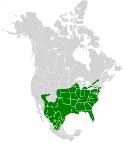 The hackberry emperor is found across a wide range within North America. It has been observed as far south as central Mexico and north into parts of Eastern Canada. Its range extends to the southwest into regions like Arizona, New Mexico, and other parts of the Rockies, as shown by the map. It can commonly be found across the Midwest and especially along the east coast from Florida up to New England.[3][6]