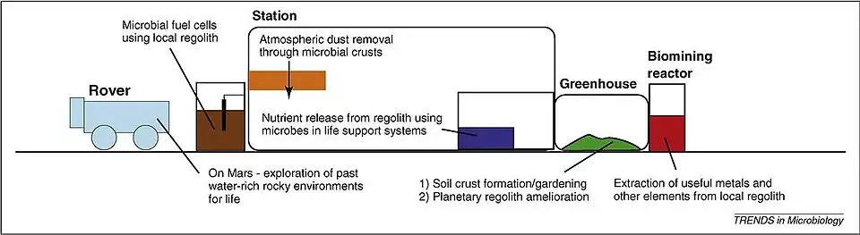 Scientists are currently working on the possibility of installing bioreactors or similar facilities on Mars, which would run entirely on cyanobacteria and provide material for the creation of fuel cells, soil crust formation, regolith amelioration, extraction of useful metals/elements, nutrient release into the soil, and dust removal; a variety of other potentially useful functions are also in the works.[11]