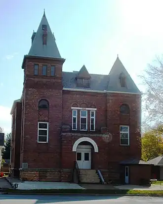 Atkinson Hall is a historic building located at 108 West Main Street in Geneseo, Illinois. The Geneseo Collegiate Institute, a Presbyterian college preparatory school that opened in 1884, built the building in 1892 for its music department. Architect J.E. Hosford designed the building in the Romanesque Revival style. The front of the red brick building faces north and has a pyramidal tower at its corners, with the northeast tower roughly 10 feet (3.0 m) taller than the northwest one. The main entrance and many of the building's windows are arched, a key feature of Romanesque architecture. The building served the college until it closed in 1922; four years later, it became the American Legion Hall, Shearer Post #350.[2]