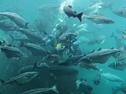 The exhibition area includes 11 larger landscape aquariums, including 2 open touch pools and 2 activity pools, plus several smaller aquariums. Together the aquariums provide a representative view of life under water along the Norwegian coast and in the northern Atlantic Ocean.[4] Daily dive shows in the 4-million-litre (1.1×106 US gal) Great Atlantic tank let visitors watch the fish being fed.[6][7] Some of the species in this tank are cod, halibut, conger and salmon.[7] On weekends, visitors can help feed the fish in the open pools.[8] In 2014, the 15-million-litre (4.0×106 US gal) "Selbukta" opened, which is one of the largest seal exhibits in the world.[1] This outside exhibit houses harbor seals.[1]