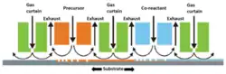 In temporal ALD the separate precursor and co-reactant doses are separated from each other in time by a purge step. In contrast, in spatial ALD (s-ALD), these gases are delivered at different locations, so they are separated in space. In atmospheric pressure s-ALD the precursor and co-reactant are delivered continuously and they are separated from each other by a gas curtain to prevent gas phase reactions. Such gas curtain typically consists of nitrogen injection and exhaust positions, see Figure 1. As a substrates moves through the different gas zones, self-limiting reactions take place at the substrate surface and the ALD process takes place. As this process can easily be accelerated, the deposition rate for spatial ALD can be much higher than for conventional ALD. For example, for ALD of Al2O3 the deposition rate increases from 100-300 nm per hour to 60 nm per minute.[6]