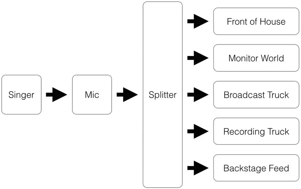In this example, we will explore the signal flow of a hypothetical rock concert. For our example, this concert not only has a live audience, it is also being broadcast on live TV, and it is being recorded, with copies of the recording being sold to the public immediately after the concert is over. The signal from each microphone is therefore being sent to five places; the house sound system, the in-ear monitor system for the performers, the broadcast system, the recording system, and to the lobby, restrooms, and backstage areas so that people can hear the performance while outside the performance area.