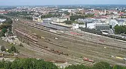 The first Augsburg station was opened in 1840 by the Munich-Augsburg Railway Company (München-Augsburger Eisenbahn-Gesellschaft) near the Rotes Tor (Red Gate). Its historic hall served in 1880 as a military riding school and since 1920 it has been part of the main workshop of the traffic branch of Stadtwerke Augsburg (Augsburg's municipal utility).[5] After the nationalisation of the line in 1846, the current station was built. Augsburg Hauptbahnhof is a through station with four central platforms (which each have two faces and are not accessible for the disabled), nine through tracks and six bay platform tracks (only three of which are in use). Platform 1 is located next to the station building and has one side.