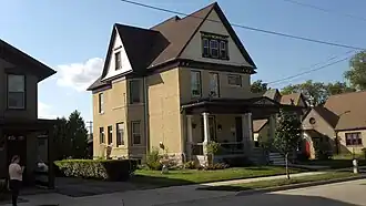 The house was built in 1893 for local brewer August Fuermann Jr., his wife Eliza, and their two children. August died unexpectedly later in the same year, and Eliza sold the house to hatmaker Clara Weiss, who lived there for 40 years.[2] The two-and-a-half story brick house has a Queen Anne design with elements of the Neoclassical style; Queen Anne architecture was popular throughout the United States in the late twentieth century. The design features a wraparound front porch with a pavilion at the main entrance, multi-story bay windows on the south and north facades, and a front-facing gable end with decorative shinglework.[3]