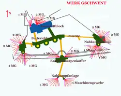 From 1884 onwards, many new defences were built according to a relatively uniform scheme overseen by Field Marshal Julius Ritter von Vogl.[14] In particular, the passes in the Dolomites and the Brenta were fortified for the first time, as was the Predil Pass in modern Slovenia. Lardaro was reinforced with the new Corno works;[15] the defences of Trento were expanded with the Romagnano and Mattarello works[16] and the Riva fortress was reinforced with the new batteria di mezzo.[17] The Vogl works were compact integrated structures combining armament and accommodation in a single block. They were mostly built of concrete, with the front clad with granite blocks. The armament consisted of mostly three or four 12-cm cannons behind armoured embrasures, and two to four 15-cm mortars in armored rotating domes on the roof.[18] The works were surrounded by a ditch that could be swept by fire from several caponiers. For close defense, 11 mm mitrailleuses were initially used and machine guns installed from 1893. Because of their embrasures and being built several stories high they had a marked elevation above ground.