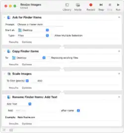 Automator documents are called workflows, and are made up of actions. Workflows are run sequentially, with each action being given the previous action's output, which it can then process or act upon. Variables can be specified, which can be modified or processed by subsequent actions.[3] Workflows can also incorporate loops and variables.[4] Automator comes with a library of actions (file renaming, finding linked images, creating a new mail message, etc.).[5][6] Actions can also run custom scripts, including AppleScript, JavaScript, or shell scripts. Workflow documents can be run directly in Automator or saved as applications that run the workflow when launched. Workflows can also be added to the contextual menu, to process any selected text or file.[7][8][9]