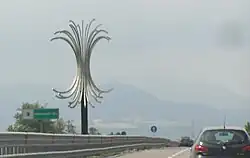 Autostrada A15 near Parma, with the steel monument in the shape of a "tuft" placed in the large traffic island between the two carriageways.