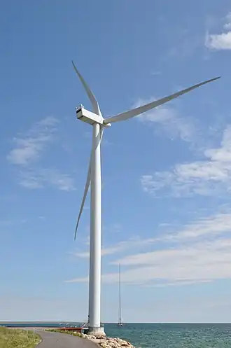 Avedøre Holme Offshore Wind Farm is a nearshore wind farm right off the coast of Avedøre, Copenhagen. It was commissioned in 2009 with three 3.6 MW Siemens turbines as a demonstrator project for future offshore wind turbines.[2][3][4][5][6] Ørsted owns two turbines, and a private collective owns the third.[2] Ørsted and partners build a 2MW hydrogen electrolysis station at Avedøre Power Station supplied by Ørsted's two turbines.[7]