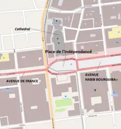 Avenue Habib Bourguiba (Tunisian Arabic: شارع حبيب بورڨيبة) is the central thoroughfare of Tunis, and the historical political and economic heart of Tunisia.[1] It is named for Habib Bourguiba, the first President of Tunisia and the national leader of the Tunisian independence movement. Today, the broad Avenue aligned in an east-west direction, lined with trees and facades of shops, and fronted with street cafes on both sides, and which is compared to the Champs-Élysées in Paris, and its extension, the Avenue de France, Place de l'Indépendance marking the central roundabout with Lake of Tunis at the eastern end. Many of the important monuments are located along this avenue, including Cathedral of St. Vincent de Paul, French Embassy in Tunisia and Théâtre municipal de Tunis.[2][3]