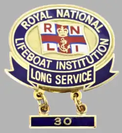The Decoration of the Institution was awarded for conspicuous and special services to the RNLI, other than actual personal life-saving.[13] Established in 1901, many awards were made for long and devoted service by Branch Honorary Secretaries and Ladies Auxiliaries.[14]