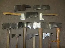 Around 1900, all-steel heads came into use. An online video from 1964 captures the effort required to make axes, including steeling the head and hanging ("hafting") a handle or haft.[2]