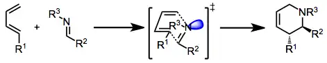 The aza-Diels–Alder reaction is a modification of the Diels–Alder reaction wherein a nitrogen replaces sp2 carbon.[1] The nitrogen atom can be part of the diene or the dienophile.