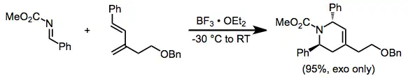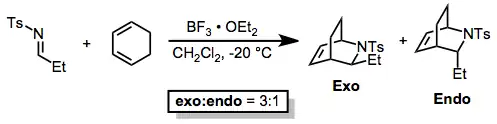 Attaching an electron-withdrawing group to the imine nitrogen increases the rate. The exo isomer usually predominates (particularly when cyclic dienes are used), although selectivities vary.[4]