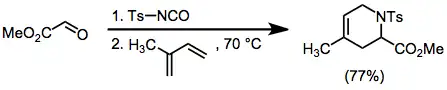 Tosylimines may be generated in situ from tosylisocyanate and aldehydes. Cycloadditions of these intermediates with dienes give single constitutional isomers, but proceed with moderate stereoselectivity.[10]