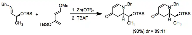 - ^ Ishimaru, K.; Watanabe, K.; Yamamoto, Y.; Akiba, K.-Y. (1994). "Stereocontrol in [4+2]Type Cycloaddition of an Aldimine Derived from (S)-Ethyl Lactate with 2-Siloxy-1,3-butadienes". Synlett. 1994 (7): 495. doi:10.1055/s-1994-22902.