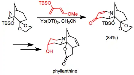 The aza-Diels–Alder reaction has been applied to the synthesis of a number of alkaloid natural products. Danishefsky's diene is used to form a six-membered ring en route to phyllanthine.[15]