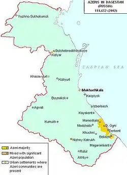 Such assimilation notably affected not only Turkic-speaking peoples of Dagestan. In the past, southern Dagestan had a large Tat population which originally spoke an Iranian language like other Tats. In 1866, they numbered 2,500 people[11] and by 1929 lived in seven villages, including Zidyan, Bilgadi, Verkhny Chalgan, and Rukel.[31] However, by the beginning of the twentieth century most of them had become Azeri-speaking and assumed Azeri identity in the later decades.[11] Today, 16 out of 40 settlements in Derbent are majority-Azeri populated, and in nine more, Azeris constitute either a relative majority or a significant minority: Berikei, Delichoban, Velikent, Verkhny Chalgan, Nizhny Chalgan, Sabnova, Dzhemikent, Zidyan, Zidyan-Kazmalyar, Mitagi, Mitagi-Kazmalyar, Kala, Mugarty, Muzaim, Padar, Kommuna, Rukel, Tatlyar, Karadagly, Bilgadi, Belidzhi, Arablinsky, Arablyar, Gedzhukh, Chinar, Nyugdi, Rubas, Salik, Ullu Terekeme, Khazar, the town of Mamedkala.