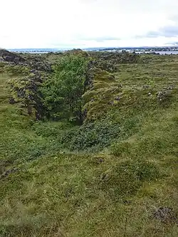 Another lava channel reaches west from Búrfell in direction of Kaldársel, but as it is filled up with lava, it is not easily found as a landscape feature.[8] This is the oldest lava channel, it is named Lambagjá ([ˈlampaˌcauː], "lamb canyon"), the youngest is Kringlóttagjá ([ˈkʰriŋlˌouhtaˌcauː], "round canyon") south of Búrfellsgjá,[6] where there was also a lava pond.[3]