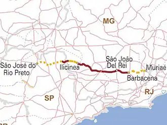 It is mostly composed of a single track and has sections in the middle of mountains, in the Zona da Mata,[1] as well as sections in the middle of farms, mainly in the Southwest region of Minas.[2]
