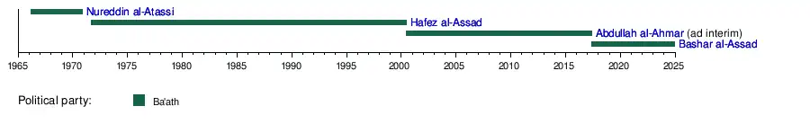 Hafez al-Assad became the Secretary of the Syrian Regional Command of the party in 1970 and Secretary General of the National Command in late 1970.[11][12] Although he died in the year 2000, Hafez al-Assad continued to be named as the official Secretary General of the National Command. Bashar al-Assad became the Regional Secretary of the party in Syria after his father's death in 2000.[13][14] In 2017, Bashar al-Assad was elected the Secretary General of the National Council.[15]