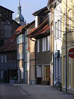 The historical Bach House is one of the oldest residential buildings in Eisenach. It originally consisted of two buildings, of which the eastern part was built in 1456 and the western part in 1458. At around 1611, both were joined.[10] As was normal with the Ackerbürgerhäuser (burghers' houses) of that time, the ground floor was used for agricultural purposes: today's instrument hall may have been used as a barn, and the rooms next to the stairs for cattle and horses.[11] In the museum, a cowbell from 1688 found in the Bach House garden reminds of this past. In the first floor of the building, a Renaissance glass window frame and the timber panelling of the living room now decorated as Composing Studio still bear witness of the citizen status of the house's former occupants. At the time of Bach's birth it was owned by Heinrich Börstelmann, headmaster of the Latin School. In 1746, the family of Caroline Amalie Rausch née Bach moved into the building and lived there until 1779. Caroline Amalie was the daughter of Bach's second cousin and friend Johann Bernhard Bach and sister to Johann Ernst Bach, a student of Bach at Leipzig and then court music director at Eisenach.[12]