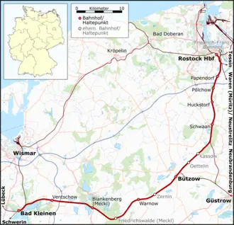 ![]() Route of the Bad Kleinen–Rostock line | ||||||||||||||||||||||||||||||||||||||||||||||||||||||||||||||||||||||||||||||||||||||||||||||||||||||||||||||||||||||||||||||||||||||||||||||||||||||||||||||||||||||||||||||||||||||||||||||||||||||||||||||||||||||||||||||||||||||||||||||||||||||||||||||||||||||||||||||||||||||||||||||||
