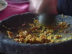 Balinese dishes are punctuated by basa genep, the typical Balinese spice mix used as the base for many curry and vegetable dishes.[8] As well as bumbu (seasoning) used as a marinade. Tabia lala manis, which is a thin soy sauce with chili peppers, and sambal matah are popular condiments.[9]